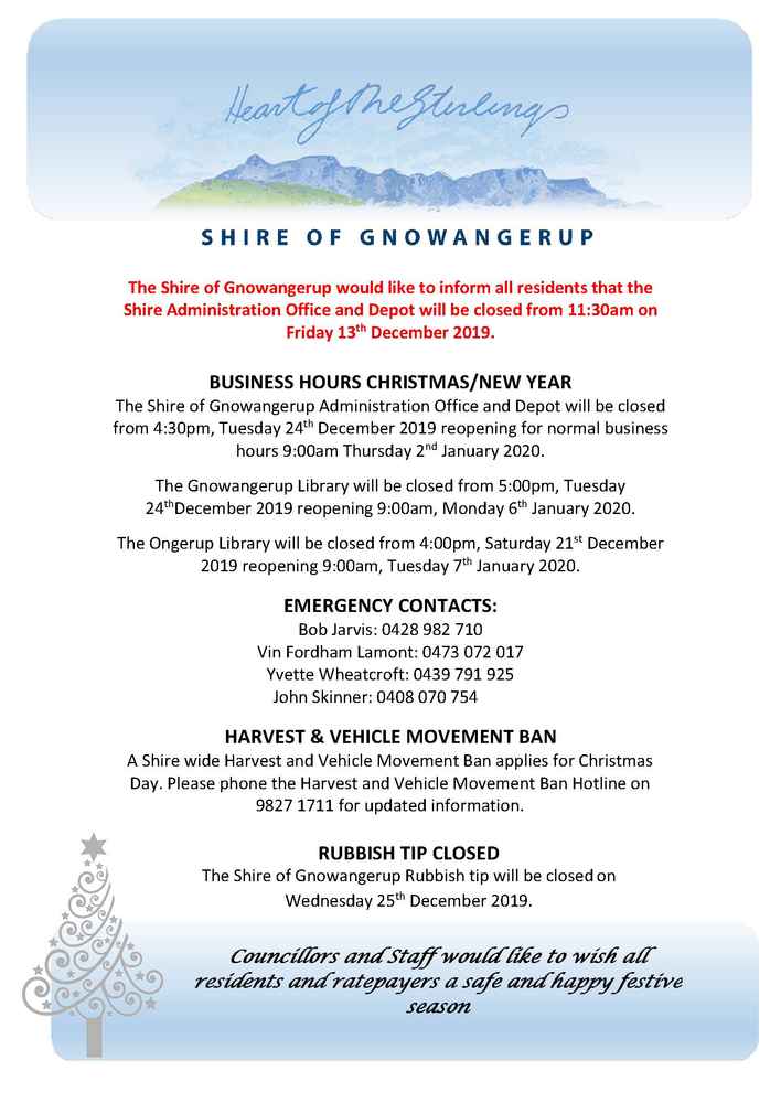 Gnowangerup Shire's Business Hours Christmas / New Year