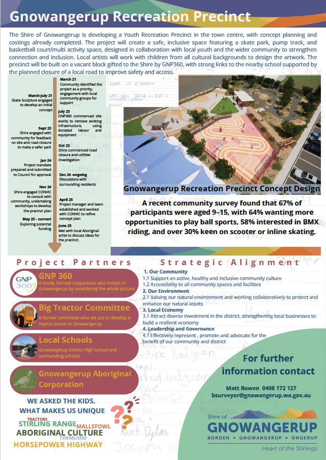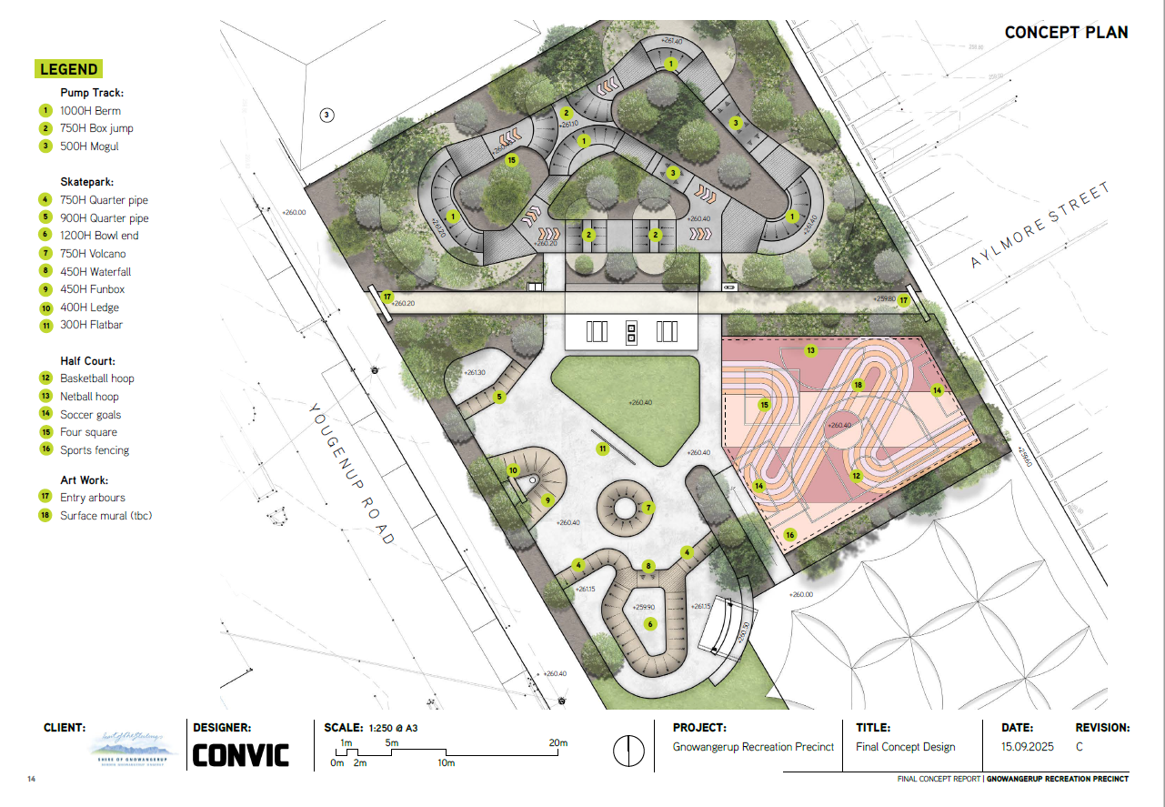 Consultation has been undertaken and sincere thanks to everyone who provided input — your voices have shaped the direction of the Precinct. During the initial consultation participants were asked to vote for their top four preferred inclusions in the Recreation Precinct. The options included a variety of skate, play and passive recreation activities. Looking at the results three standouts were highlighted as SKATEPARK, PUMP TRACK AND BASKETBALL, the design incorporates a combination of all three activities. Although the initial consultation is complete, this remains an ongoing process: the Shire of Gnowangerup is committed to delivering the project as a genuine collaboration with the community. Although no major changes will be made from now, the community are still encouraged to please reach out to the Shire if you would like to chat further about the precinct plans. Consultation also extends to the key agencies that hold infrastructure assets (such as Telstra, Water Corporation and Western Power) and their involvement often means more complex processes and longer coordination times. Based directly on feedback from young people, surveys and workshops Convic developed a concept design report. Summarising the consultation and providing a design that suits the space and our community’s needs. Following further consultation further tweaks were made to refine the vision. The concept design has now been finalised and reflects what local youth identified as priorities.